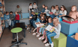 aus der ersten Klasse in der Bücherei vorlesen.